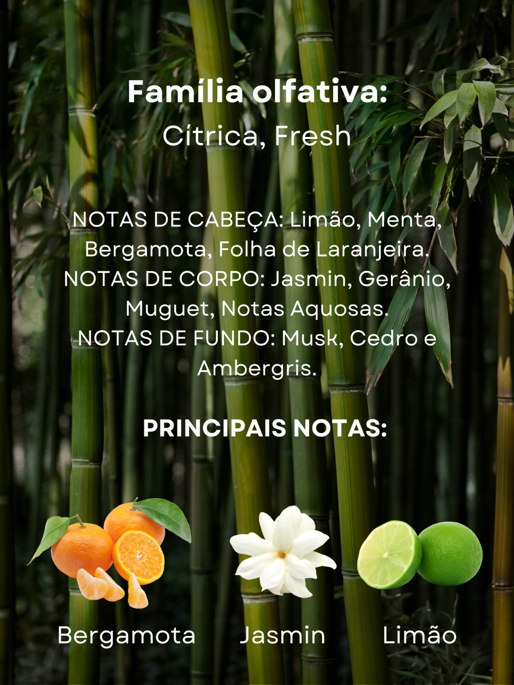 Limão, Menta, Bergamota, Folha de Laranjeira – a entrada é cítrica, gelada e vibrante, como uma água aromatizada com folhas frescas e gotas de limão espremido na hora.