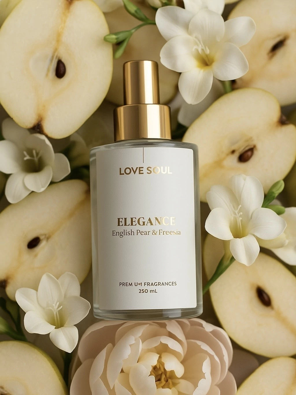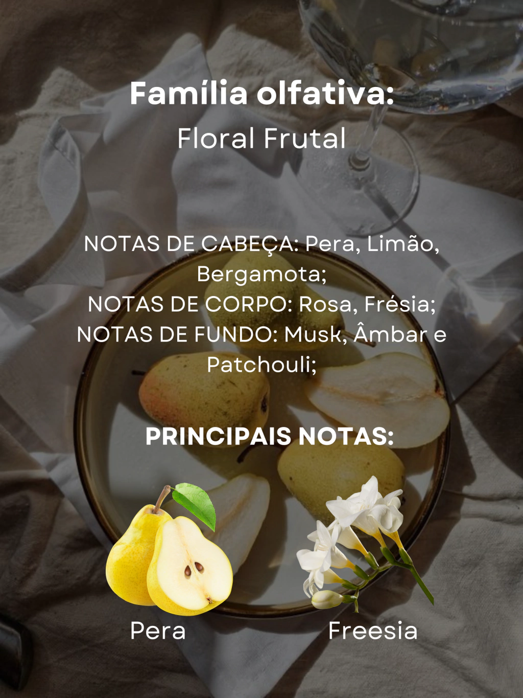 Combinando o frescor da pera inglesa à delicadeza da frésia, este aroma floral frutal foi criado para quem busca elegância atemporal e uma experiência sensorial refinada.