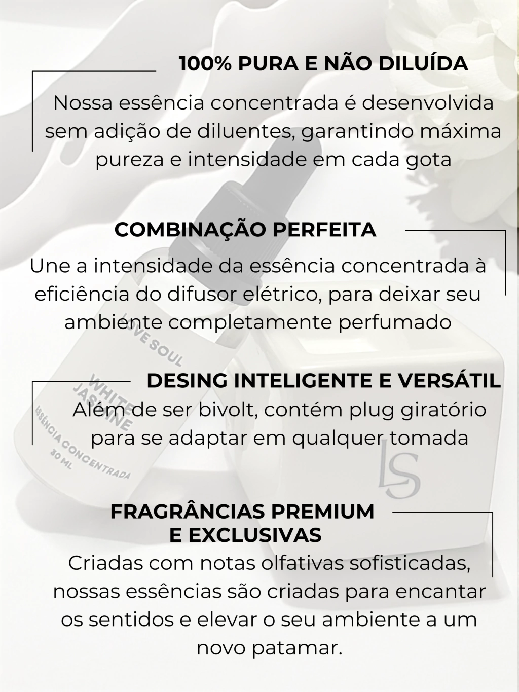 Garanta o seu Kit Difusor Elétrico de Tomada e Essência Concentrada agora e experimente a facilidade de manter sua casa sempre perfumada. Faça parte do universo aromático da LOVE SOUL e transforme seu espaço em um refúgio de fragrâncias inesquecíveis!