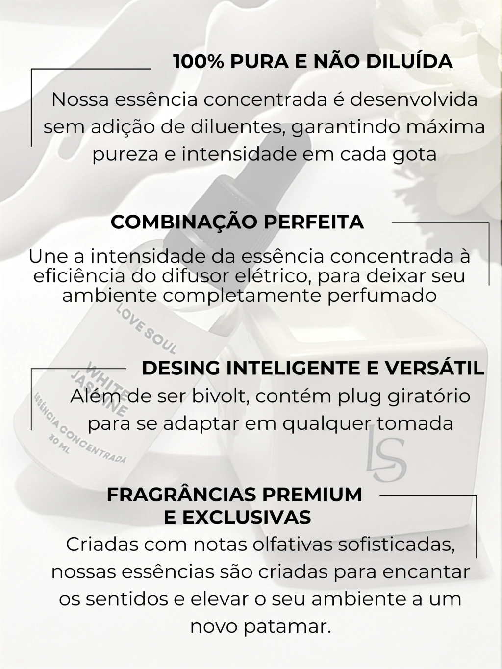 Garanta o seu Kit Difusor Elétrico de Tomada e Essência Concentrada agora e experimente a facilidade de manter sua casa sempre perfumada. Faça parte do universo aromático da LOVE SOUL e transforme seu espaço em um refúgio de fragrâncias inesquecíveis!
