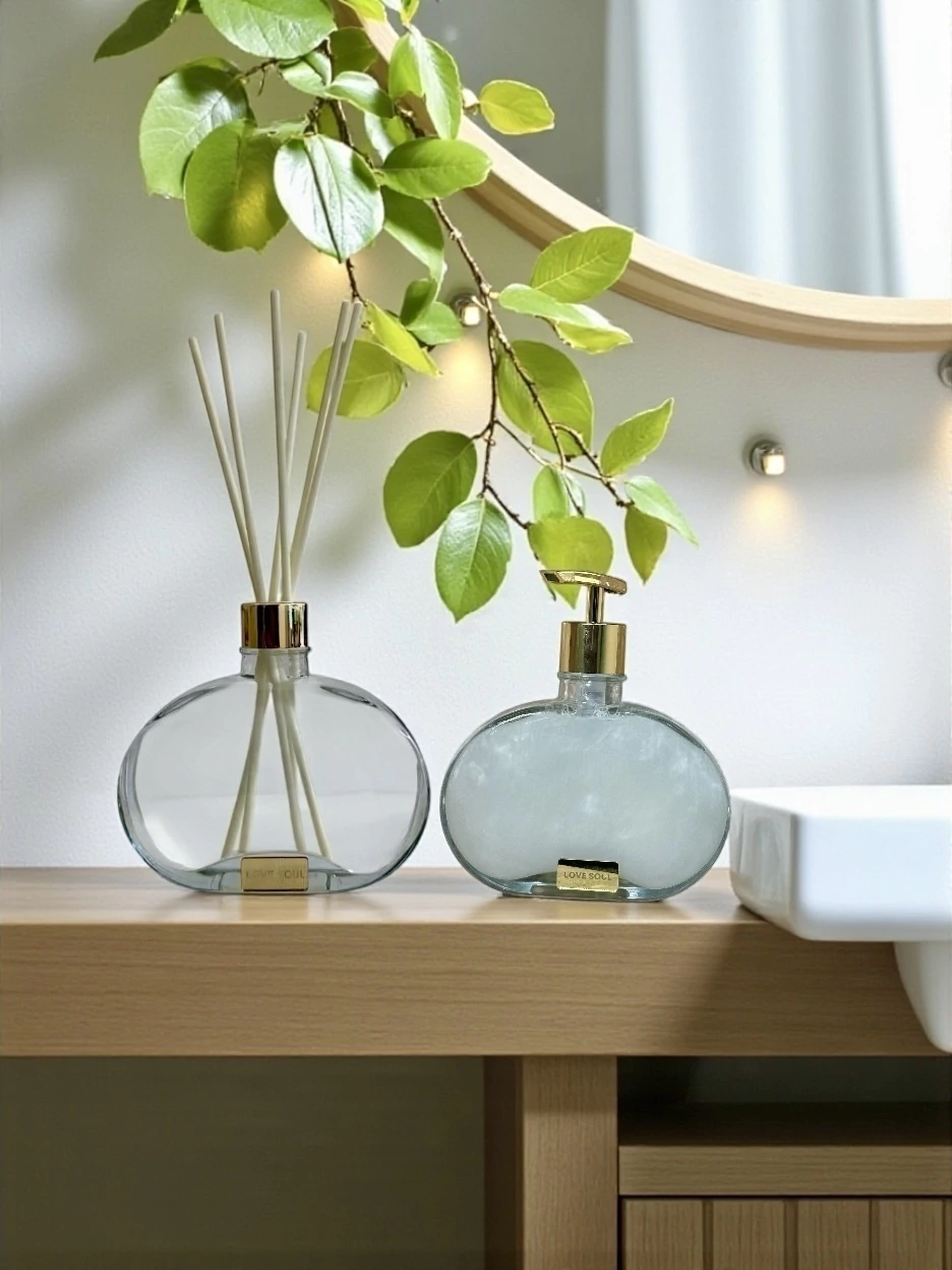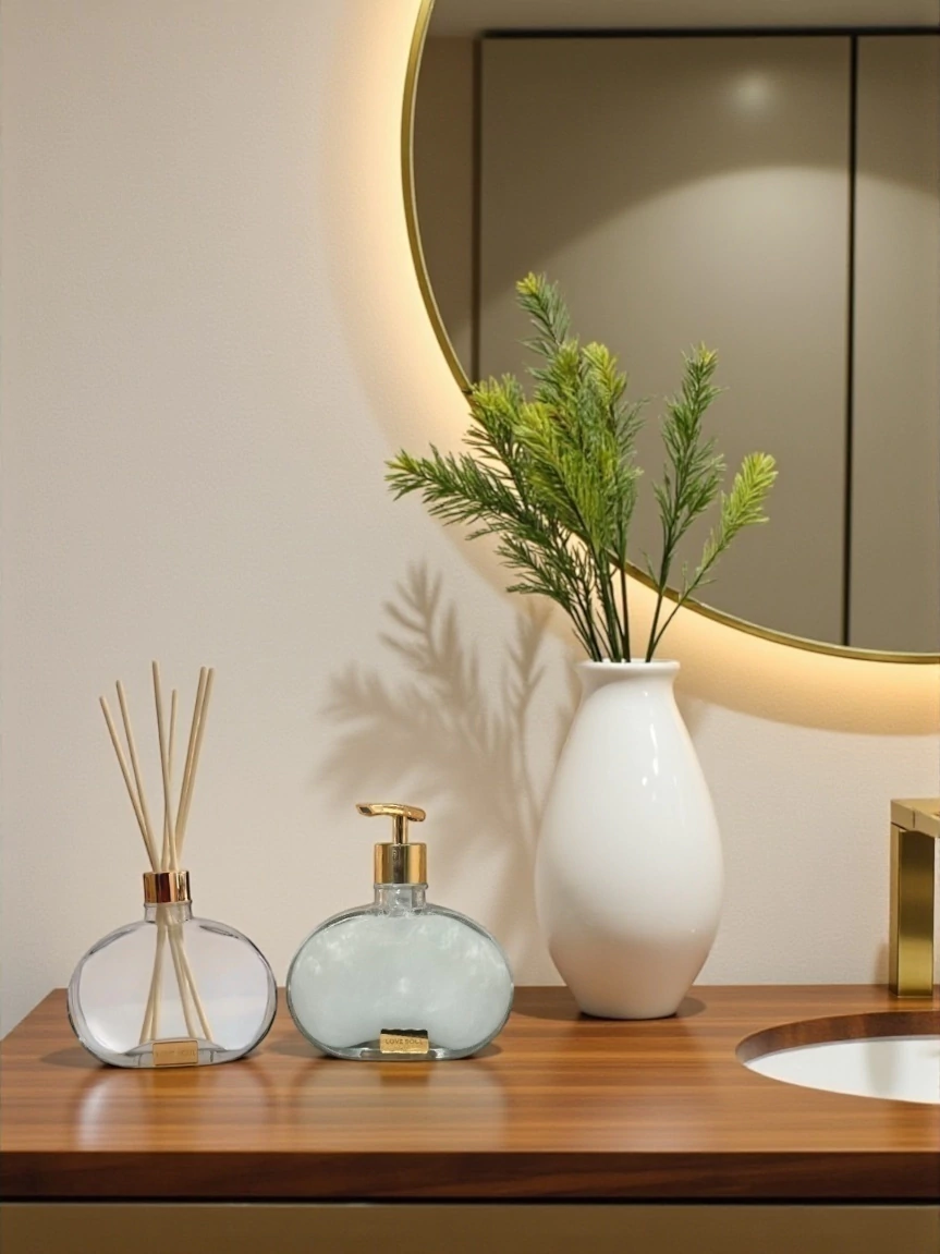 Os frascos em vidro elegante com detalhes em dourado elevam a decoração, tornando o ambiente ainda mais acolhedor e refinado.