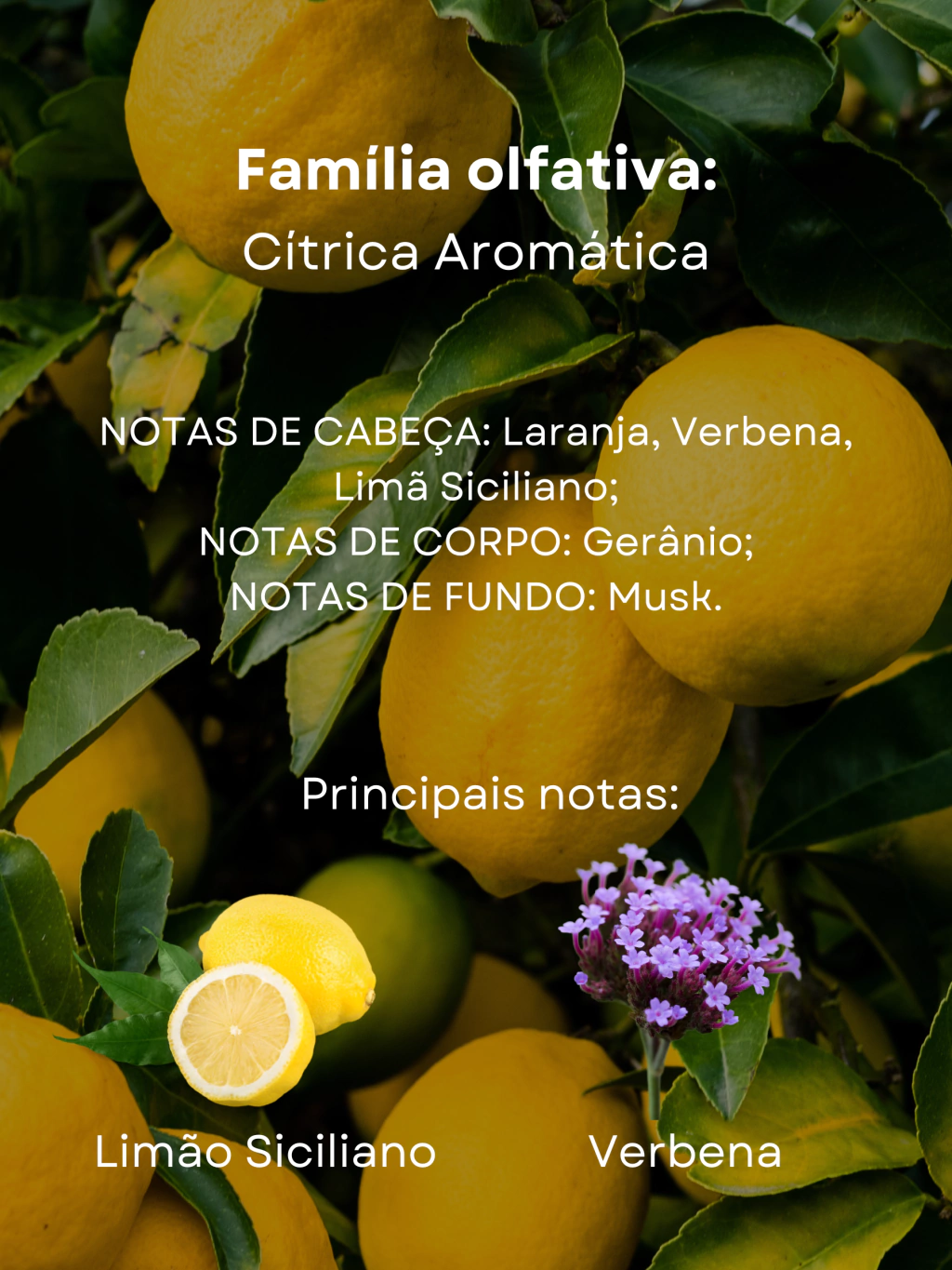 NOTAS DE CABEÇA: Laranja, Verbena, Limão Siciliano;